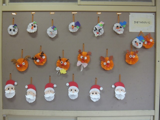 12月の掲示を作りました。色画用紙を折りたたみ、それを広げて雪だるまの顔やトナカイの顔、サンタさんのひげの部分にしました。一人ひとり表情豊かな作品に仕上がりました。