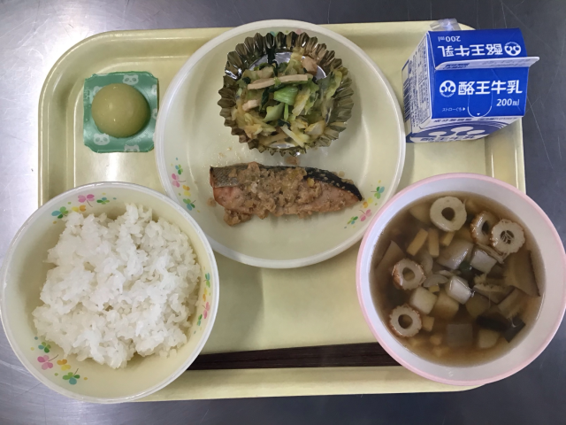 今日は、『食育の日』献立です。「ごはん、牛乳、鮭の三味焼き、重(湖南町の郷土料理)、辛子和え、ひとくちりんごゼリー」