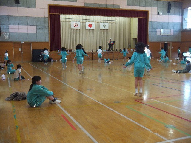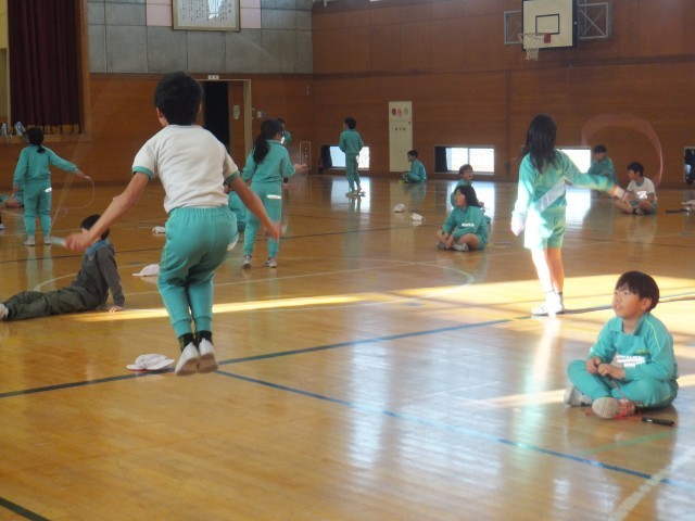 体育の時間、なわとび記録会に向けて練習をしています。一人ひとり、自分のめあてをもって取り組んでいます。友だちの跳んでいる回数を数えたり、励ましたりする姿が見られました。
