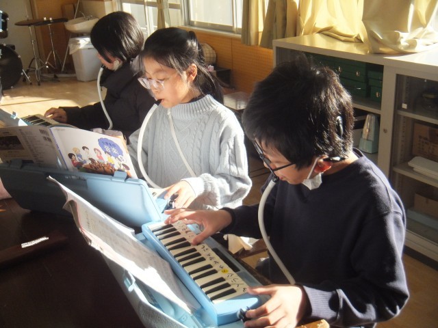 音楽の時間、『キリマンジャロ』の合奏に取り組んでいます。この曲は、スタッカートや休符がたくさん出てきます。スタッカートや休符、同じリズムの繰り返しに気を付けて、鍵盤ハーモニカやリコーダー、アコーディオンなどに分かれて、パート練習をしました。
