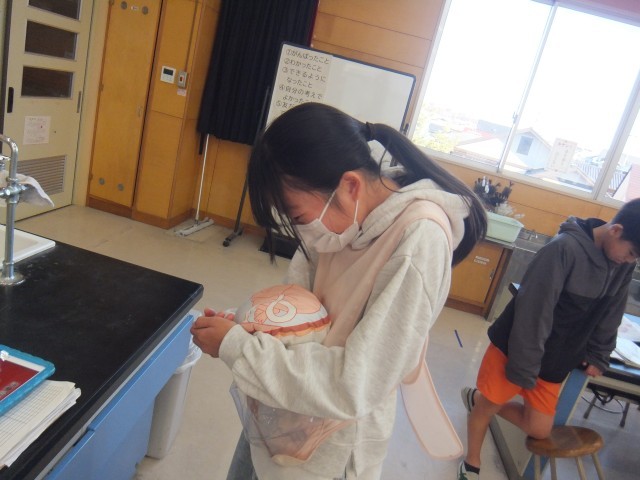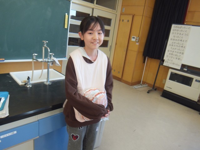 理科の時間、「人のたんじょう」について学習をしています。学習に入る前に、おうちの人に、「自分はおなかの中にいるとき、どんな様子だったのか」「生まれてくるまで、どのくらいかかったのか」「生まれたとき、どのくらいの大きさだったのか」などをインタビューしました。おなかの中のときや生まれたときの写真、へその緒、母子手帳などを見せてもらった児童もいました。そこで、自分がどのくらいの重さだったのかを妊婦模擬体験しました。「思っていたよりも重かった。」「この重さで10ヶ月近く過ごしていたと思うと、お母さんのたいへんさが少しわかった。」と、自分の成長を感じると同時に、おうちの方々への感謝の気持ちをもつことができました。