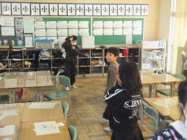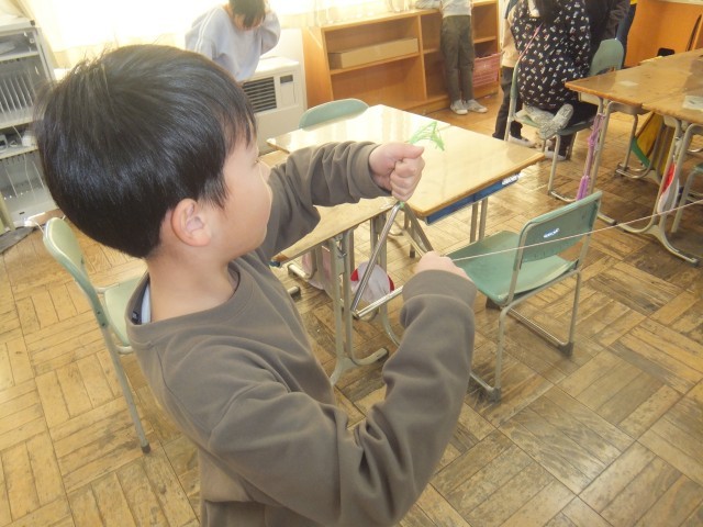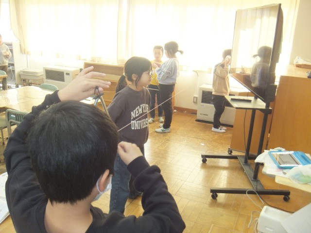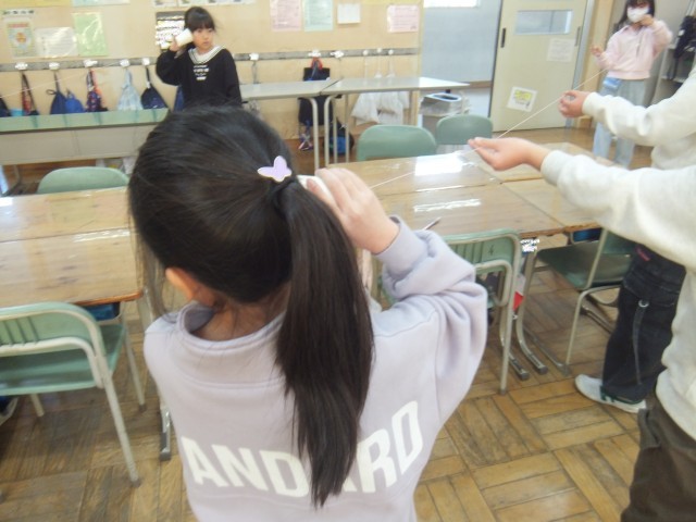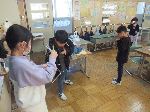 理科の時間、音が伝わるとき、音を伝える物がどうなっているかをグループごとに調べました。トライアングルと紙コップを糸でつなぎました。それから、紙コップを耳に当てて、トライアングルをそっとたたき、音が聞こえるかを調べました。糸をしっかり張った状態で、糸をつまんだり、糸を触ったりして調べる姿が見られました。また、紙コップを耳から離して、トライアングルをたたいたり、糸がふるえているかを目で見たりすることもできました。音が伝わるとき、音を伝える物はふるえていることが分かりました。