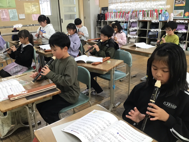 音楽の時間、同じ高さの音で重なる部分と違う音で重なる部分があることに気を付けて、アメリカ民謡である「メリーさんのひつじ」を歌ったり、リコーダーで演奏をしたりしました。今回の曲を通して、「ファ」の運指を覚えました。4分の4拍子と4分の3拍子の「メリーさんのひつじ」を、音の重なりがきれいに響くように工夫しながら演奏することができました。友だちに、階名や運指を優しく教えたり、音の重なりを喜んだりする姿も見られました。