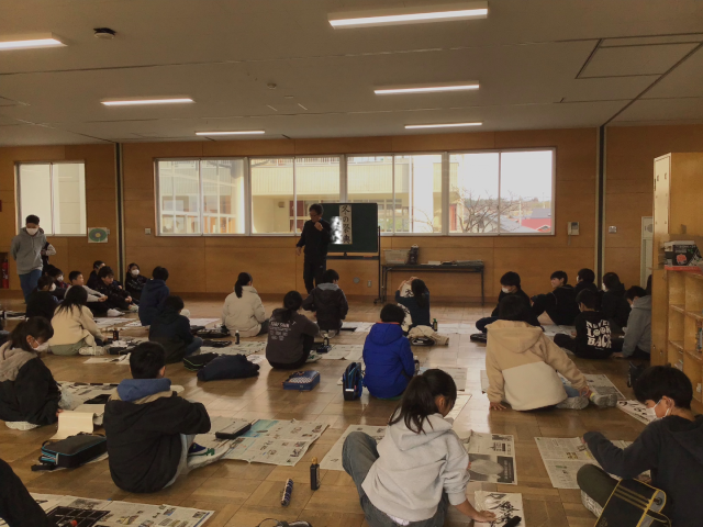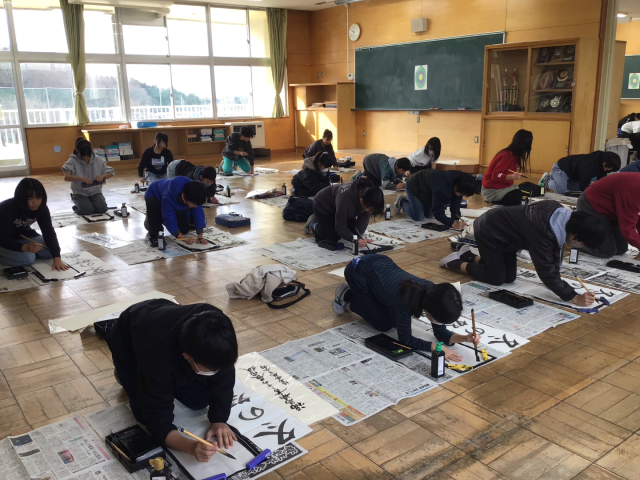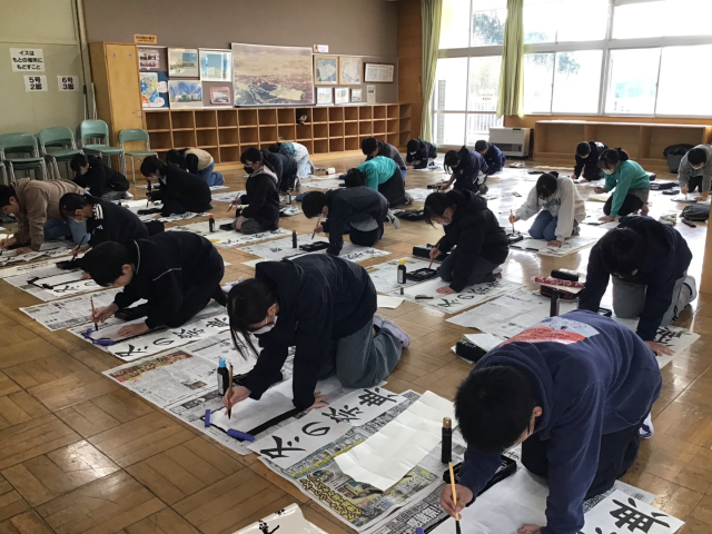書写の時間、書きぞめの練習を3クラス合同で行いました。今年の課題は「冬の祭典」です。全員が真剣に取り組むことができました。冬休みも課題として取り組みます。