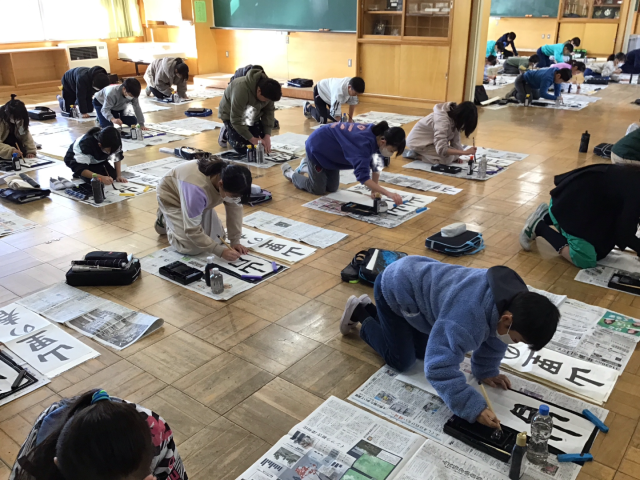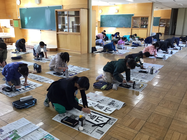 書写の時間、書きぞめの練習を2クラス合同で行いました。今年の課題は「山里の春」です。手本を見ながら、真剣に取り組むことができました。