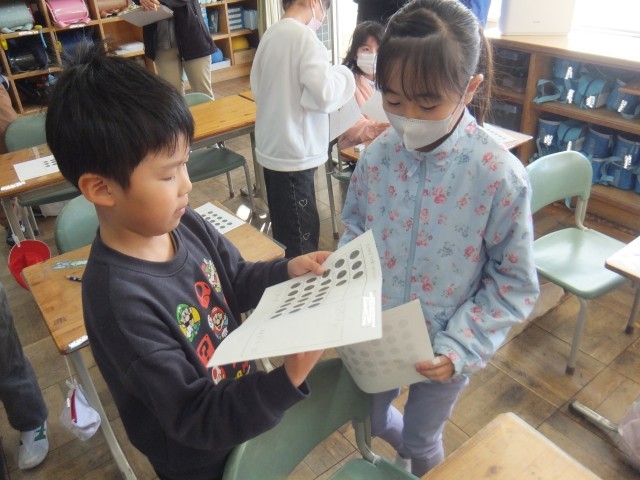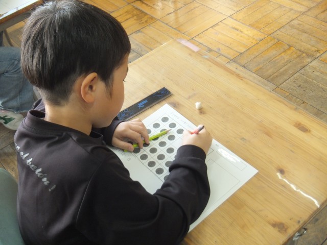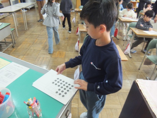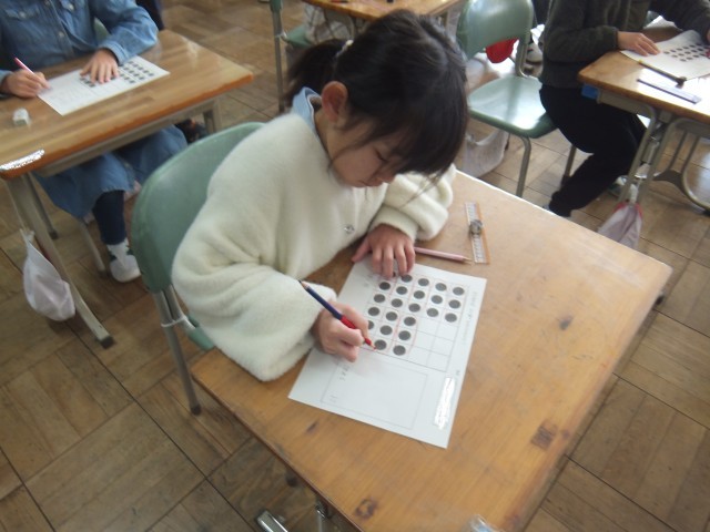 算数の時間、箱に入ったチョコレートをいくつか食べてしまい、残りのチョコレートをかけ算を使って考えました。今まで学習してきたことを生かして、分けたり、移動したり、はじめにあったチョコレートから食べてしまったチョコレートを引いたりなど、さまざまな考え方でかけ算を使うことができました。全員、真剣に考えたり、友だちと話し合ったりする姿が見られました。