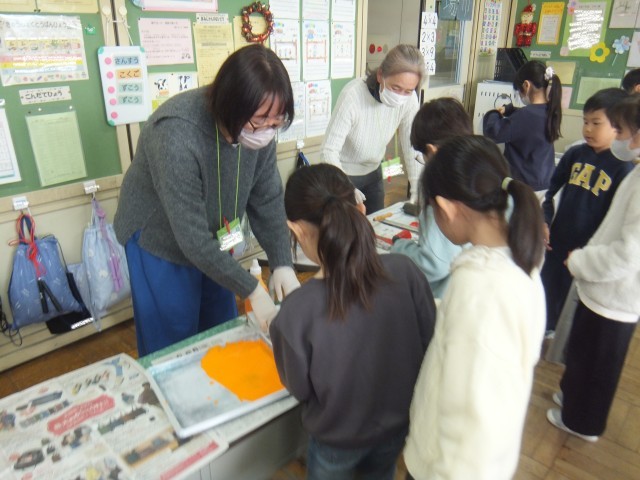 図工の時間、紙版画の型にローラーでにインクを付けたり、バレンでこすって紙に刷ったりしました。みどりっこサポーターの方々が一緒に手伝ってくれたので、落ち着いて順序よく取り組むことができました。