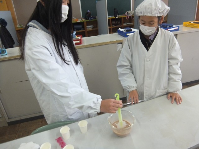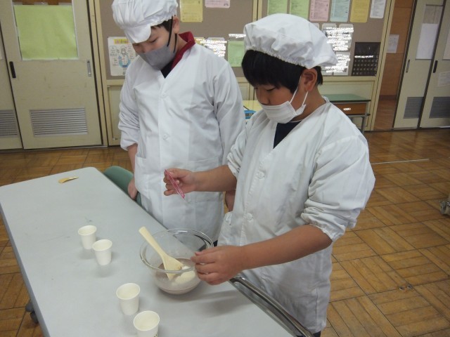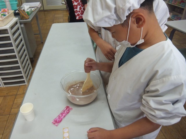 クリスマス会に向けて、チョコプリン作りにチャレンジしました。手をきれいに洗って、分量や順序に気を付けながら混ぜました。それから、冷蔵庫で冷やしました。2学期最後の日、クリスマス会のときに食べます。