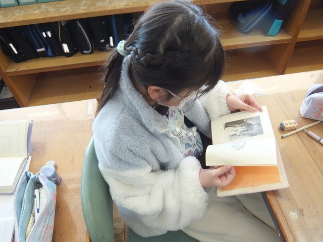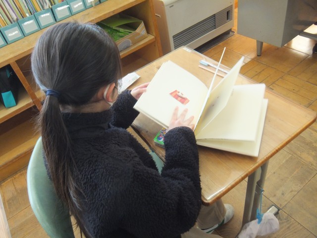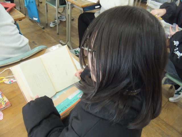 国語の時間、図書室に行き、一人ずつ詩集を借りました。その詩集の中から、自分だけの詩集を作るために、「同じ詩人の詩」「同じ事柄(動物、植物など)の詩」「書き方が楽しい詩」など、テーマを決めました。「この詩にする!」「これ、いいかも。」「この金子みすゞさん、お母さんも好きなんだよね。」と、詩集の中から見つけることができました。その詩の順番を決めたり、理由を付けたりしながら詩集を完成させます。