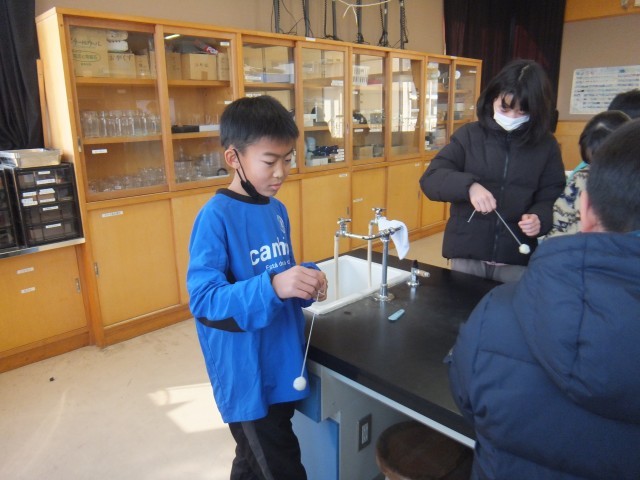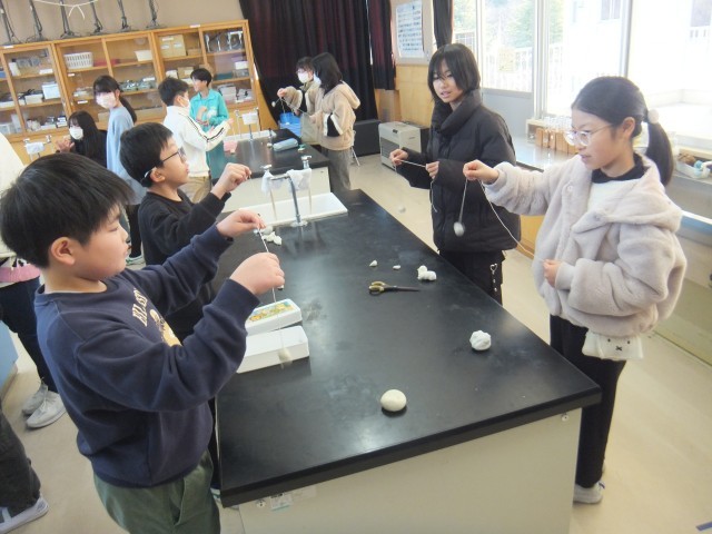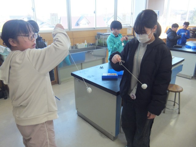 理科の時間、タコ糸と粘土を使って、自分のふりこを作りました。テンポの速い曲や遅い曲など、さまざま曲に合わせて、ふりこを動かしました。コツをつかみながら、楽しく取り組むことができました。少しずつできるようになってきました。