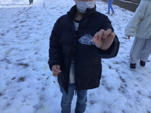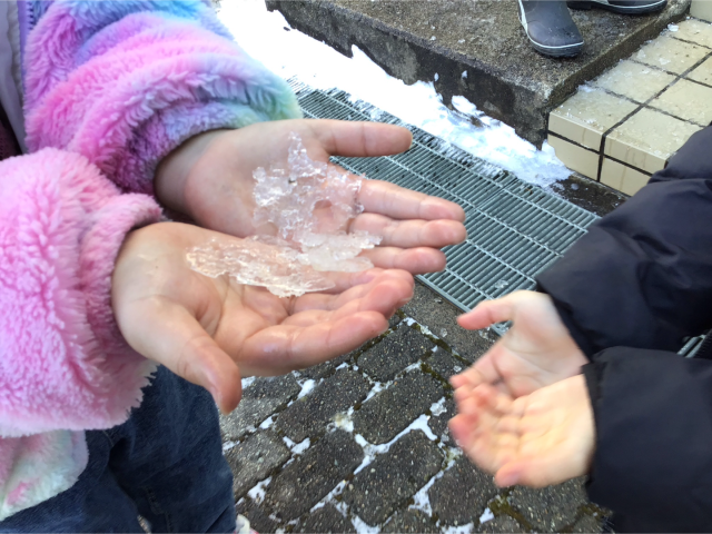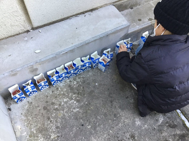 雪が降った日、外に出て、まわりの様子を観察しました。雪を触ったり、氷を見つけたりしました。そこで、みんなで氷を作ってみようというとことになりました。牛乳パックに水を入れて、日かげのところに置きました。いつ氷ができるか楽しみです。