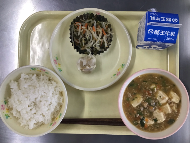 ごはん、牛乳、マーボー豆腐、ポークシューマイ、すき昆布の香味和え