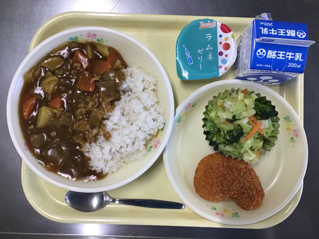 チキンカツカレーライス、牛乳、花野菜サラダ、ラムネゼリー(FeCa)