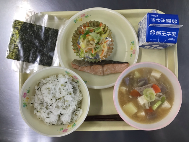 セルフおにぎり、牛乳、焼き魚(鮭)、浅漬け、豚汁