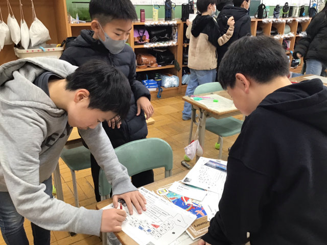 外国語の時間、自分が行ってみたい都道府県について、ペアで伝え合うゲームをしました。「Where  do  you  want  to  go  in  Japan?」「I  want   to  go   to  Shiga.」「Why  do  you  want  to  go  to   Shiga?」「I  want   to  go   to  Lake   Biwa.」など、場所やその場所を選んだ理由などを英語で質問したり、答えたりすることができました。自分から友だちを見つけて、いっしょうけんめい英語で伝えようとする姿が見られました。