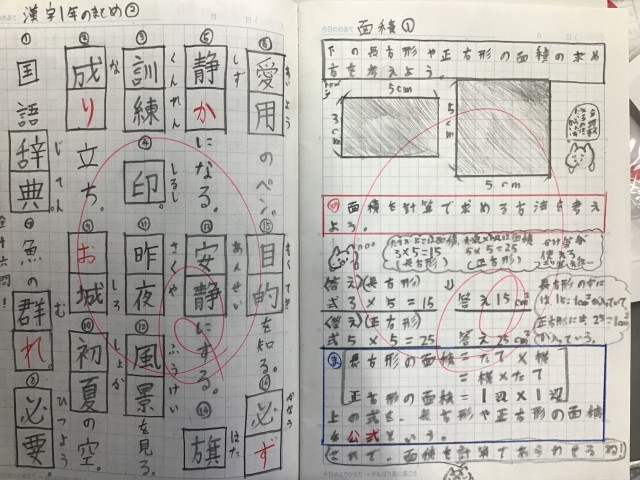 この写真はある日の児童の自主学習のノートです。4年生は毎日自主学習に取り組んでいますが、こんなに真剣に取り組んでいるお子さんがいて、とてもうれしく思っています。自主学習は、自分の苦手を克服する、得意をさらに伸ばす、見やすくまとめる力をつける、毎日継続して学習する習慣をつけるなど、良いことがたくさんあります。こんなに素晴らしいノートを書ける友達がたくさんいます。ぜひ、お子さんのノートも見てみてください!