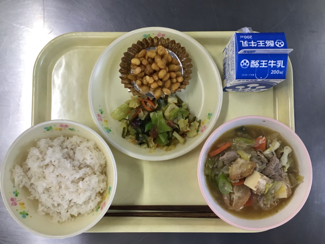 ごはん、牛乳、すき焼き風煮、豆みそ、海藻の和えもの