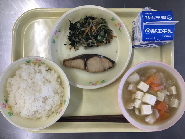 麦ごはん、牛乳、ぶりの照り焼き、野菜の海苔和え、鶏ごぼう汁