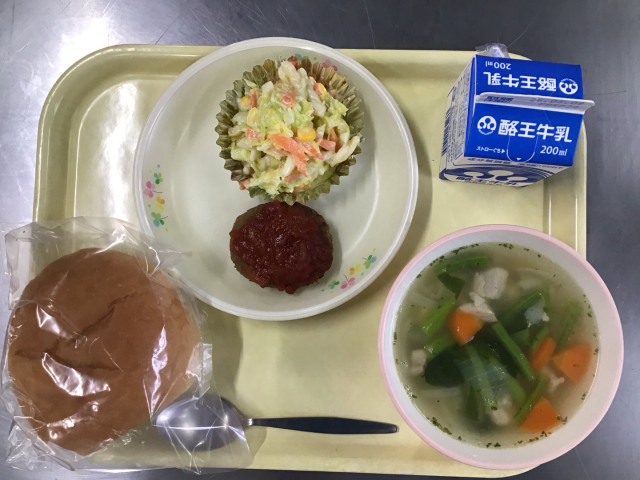 バンズパン、牛乳、チーズ風入りハンバーグトマトソース、コールスロー、コンソメスープ