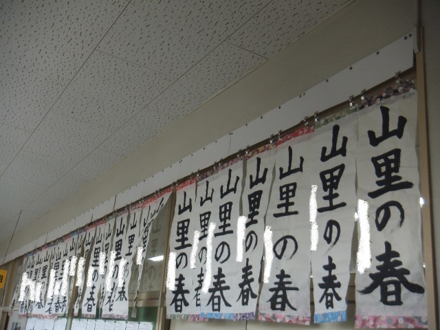 書写の時間や冬休みに書いた書き初めの作品をクラスの廊下に展示しました。みどりっこ書き初め展として、他のクラスや学年の作品も鑑賞し合っています。