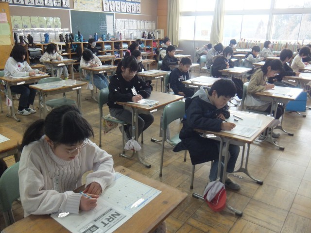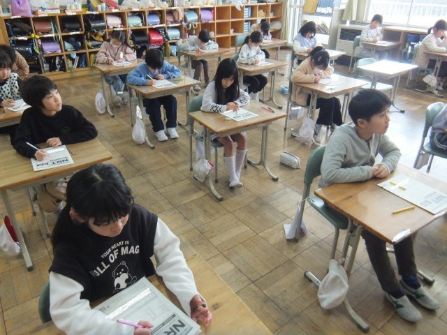 全校児童が2、3校時、学力テスト(国語・算数)に取り組みました。1年生は初めての学力テストでしたが、先生の指示をよく聞いて、集中して最後までがんばることができました。