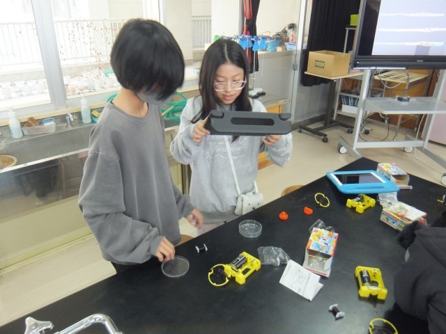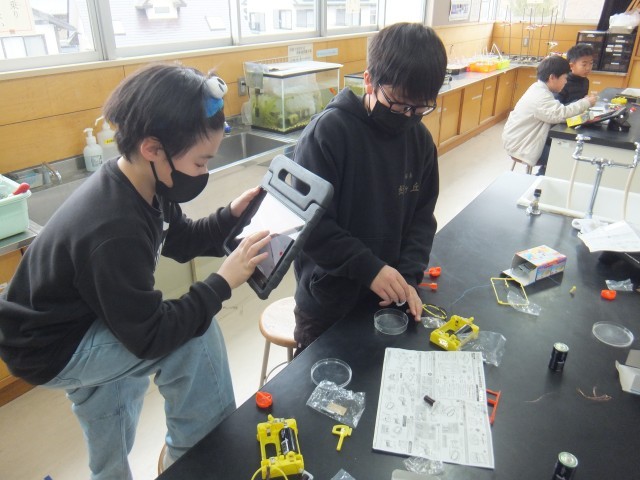 理科の時間、電磁石の動画を見て、電磁石のはたらきや性質を確認しました。実験キットを組み立てて、一人ずつ、導線を100回巻きしたコイルに鉄芯を入れた電磁石と、導線を200回巻したコイルに鉄芯を入れた電磁石を作りました。丁寧に重ねて導線を巻くことができました。その導線の巻き数を変えた2つの電磁石を使って、運ぶことができた鉄くぎの数を比べました。200回巻きの電磁石のほうが100回巻きの電磁石よりも、たくさん鉄くぎを運ぶことができました。実験の結果から、導線の巻き数を多くすると、電磁石の力が強くなることが分かりました。