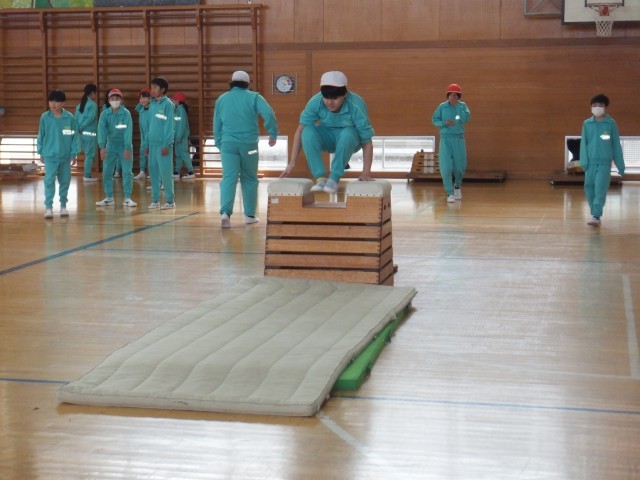 体育の時間、跳び箱運動をしました。自分の目標をもち、自分で挑戦したいコースを選んで練習をしました。友だち同士でアドバイスをしたり、先生に教えてもらったりして、いっしょうけんめい取り組む姿が見られました。