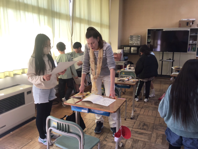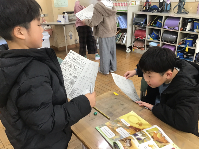 外国語活動の時間に、「私は誰でしょう?」のクイズを、英語で作りました。動物やキャラクターの特徴や好きなものを英語で書き、3つのヒントを英語で話し、友達にクイズを出す活動でした。AET先生と、楽しく活動しました。進んで友達とクイズを出し合い、交流を深めていました。