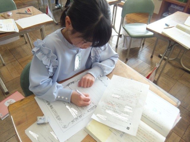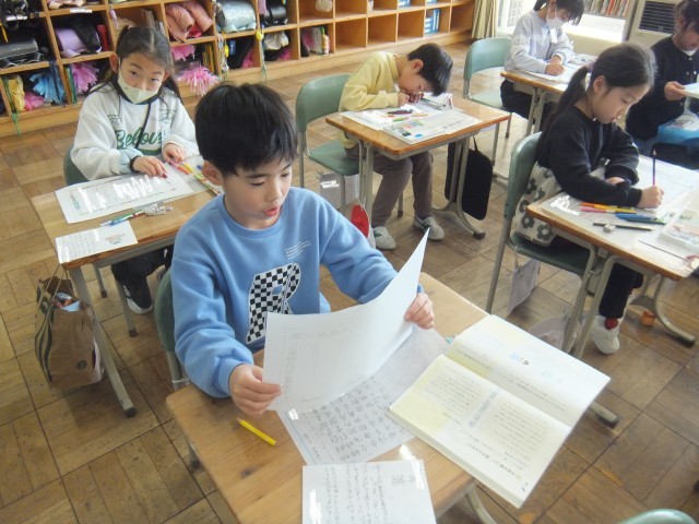 国語の時間、友だちのすてきなところを見つけて、手紙で伝える学習をしています。友だちのすてきなところやよさが伝わるように、具体的な場面を思い出したり、そのときに、どう感じたのかをメモしてから、書くことができました。書いた文章を読み返す姿も見られました。