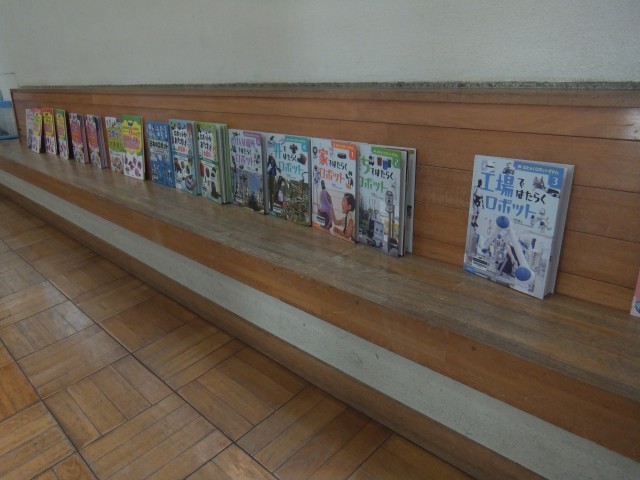 国語の時間に学習した『ロボット』に関する本を学校司書の先生が読みやすいように、2年生廊下のベンチに並べてくれました。教科書以外のさまざまなロボットの本がたくさんあります。こどもたちは、ベンチに座り、手に取って読んでいます。