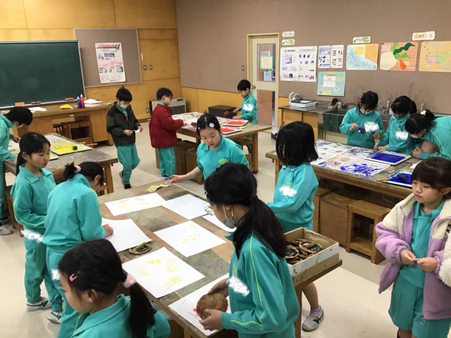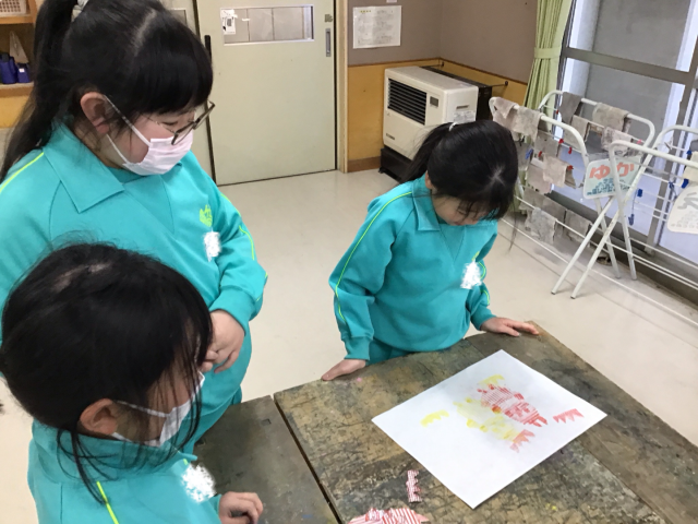 図工の時間、自分が作った版にインクを付けて刷りました。版の色を変えたり、版を何度も使い、その置き方を工夫したりしました。一人ひとりが版を組み合わせて、すてきな作品を作り上げることができました。