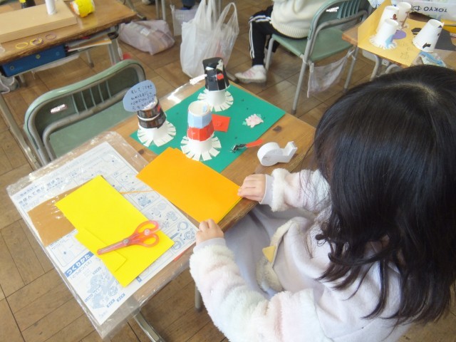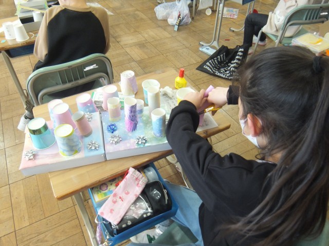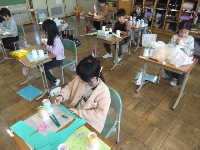 図工の時間、ゴムの力でとびだすしくみを生かして、虫や動物、ロケット、花火などを作りました。動きを試しながら工夫することができました。折り紙や色画用紙などで飾りを付けたり、ペンで模様を描いたりする姿も見られました。