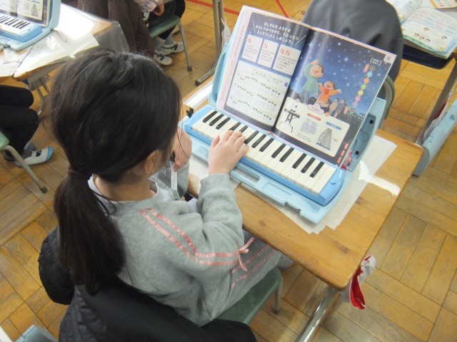 音楽の時間、星空の様子を思い浮かべながら、フランス民謡である『きらきらぼし』を歌ったり、鍵盤ハーモニカで演奏したりしています。指番号に気を付けたり、音が切れないように息を吹いたりすることができるようになりました。