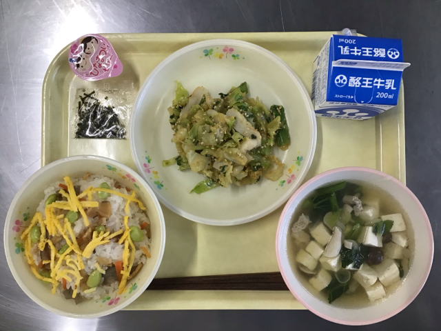 ちらしずし、牛乳、ささかまと菜の花のゴマ和え、しめじと鶏肉のすまし汁、ひな祭り一口ゼリー