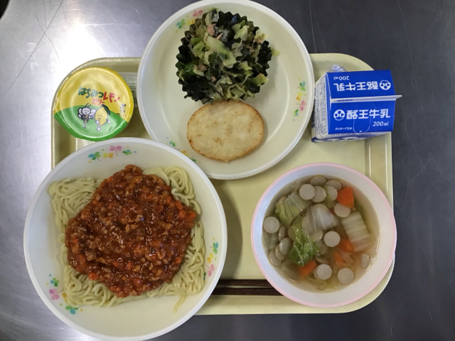 ミートソーススパゲティー、牛乳、ハッシュドポテト、ツナサラダ、白菜のコンソメスープ、はちみつレモンゼリー