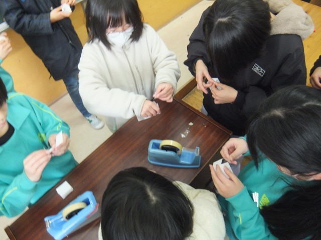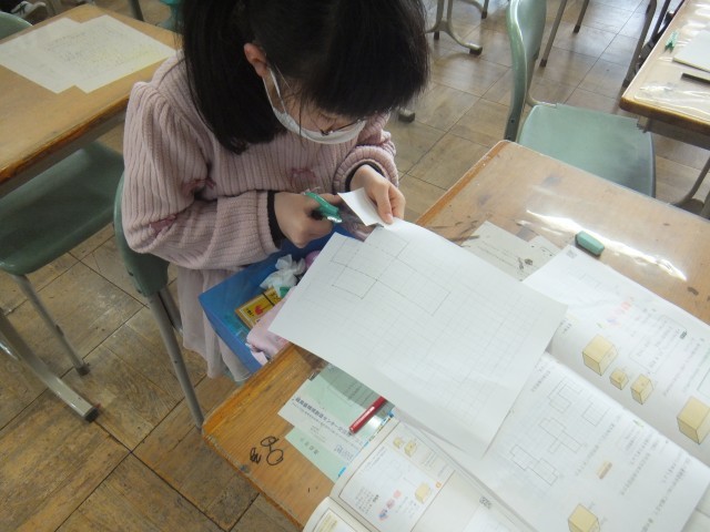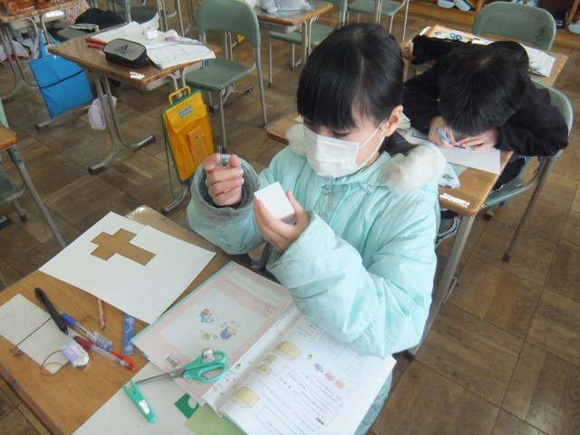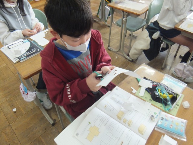 算数の時間、直方体と立方体の展開図の描き方を覚えました。工作用紙に、縦4㎝横5㎝高さ3㎝の直方体と一辺3㎝の立方体の展開図を描きました。面が6つあること、向かい合った面が同じ大きさであることを確認しながら、丁寧に描くことができました。正しく書くことができた展開図を組み立てることもできました。