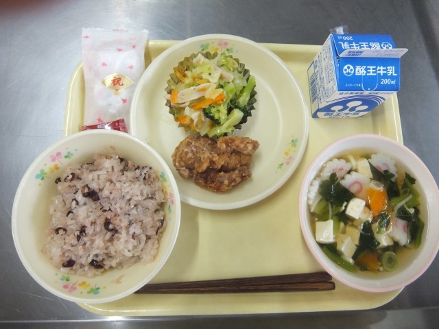 赤飯、ゴマ塩、牛乳、鶏肉の竜田揚げ、ブロッコリーサラダ、えのきだけのすまし汁、お祝い大福
