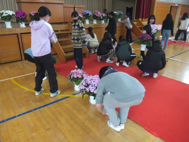 5年生が卒業式式場作成をしました。掃き掃除やイスの水拭き、赤絨毯のゴミ取り、体育館壁面の掲示、鉢花並べなどいっしょうけんめい働くことができました。6年生がすてきな卒業式を迎えることができるようにがんばっていました。いよいよ23日(月)卒業証書授与式が行われます。