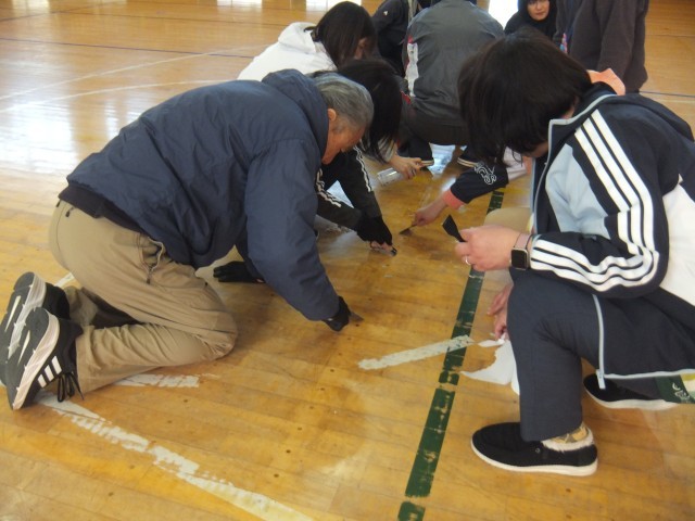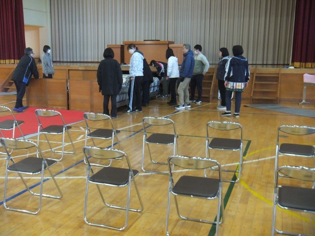 児童下校後、全教職員で卒業式式場作成をしました。体育館床のテープをはがしたり、赤絨毯の準備をしたりしました。それから、卒業生や来賓の方々、保護者の椅子をならべました。すばらしい卒業式になるようにしていきます。