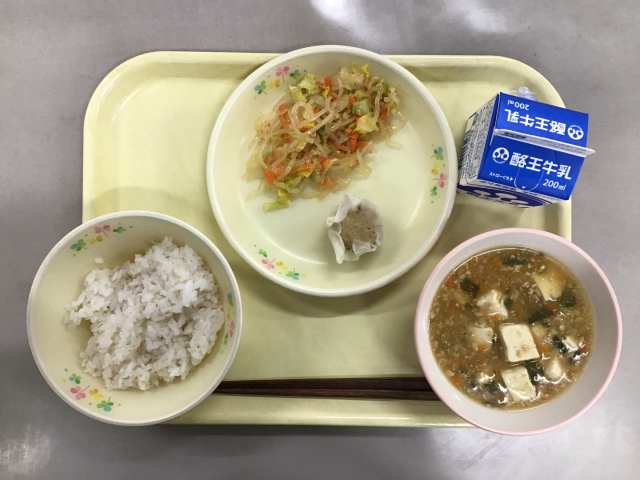 麦ごはん、牛乳、マーボー豆腐、肉シューマイ、バンサンスー