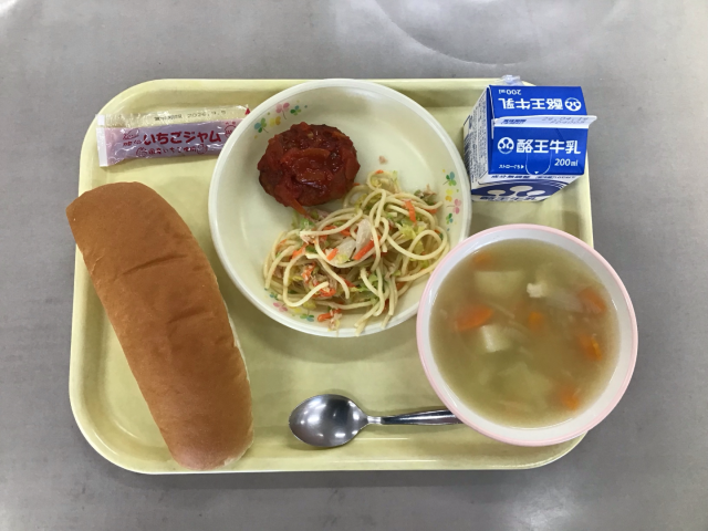 コッペパン、いちごジャム、牛乳、ハンバーグトマトソースかけ、サラスパサラダ、コンソメスープ