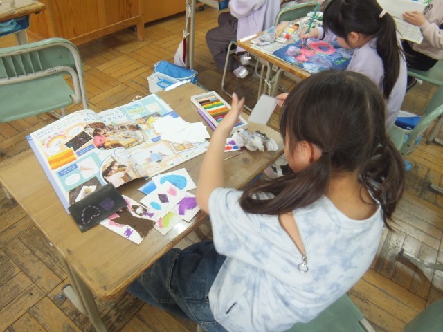 図工の時間、描きながら、自分の好きなものを見つけることを楽しみました。さまざまな大きさの画用紙の中から自分で好きな大きさの画用紙を選びました。色鉛筆やクレヨン、絵の具など、画材も自分で選んでいました。くぎを使って、ひっかきながら描く姿も見られました。