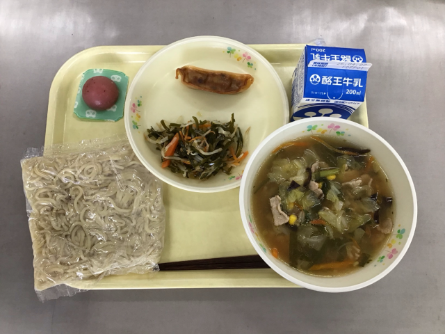 みそラーメン、牛乳、蒸しギョーザ、すき昆布の香味和え、一口とちおとめゼリー