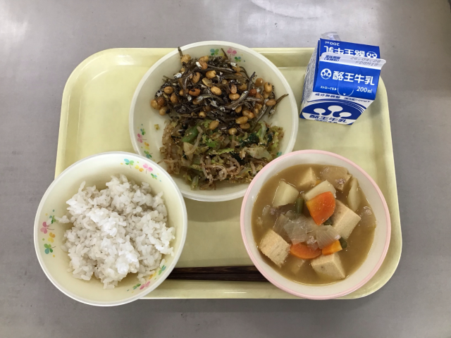 麦ごはん、牛乳、生揚げの肉みそ煮、大豆と小魚の佃煮、春キャベツのおひたし