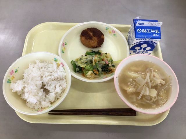 麦ごはん、牛乳、メンチカツ、和風サラダ、油揚げのみそ汁