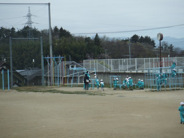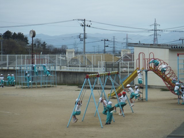体育の時間、校庭に並んでから1周を走りました。全員がんばって走ることができました。その後、遊具を使って遊びました。