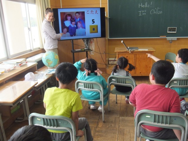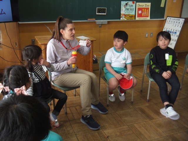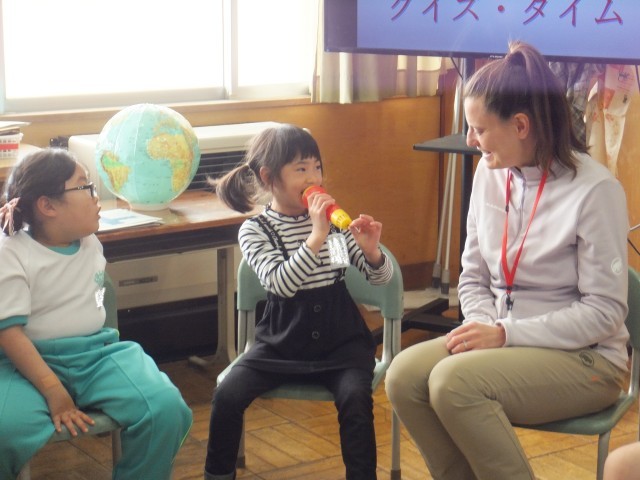 外国語活動では、AETの先生の自己紹介やクイズ大会をしました。それから、子どもたち一人ひとりが英語で自己紹介をしました。マイクを持ちながら上手に言うことができました。