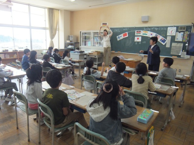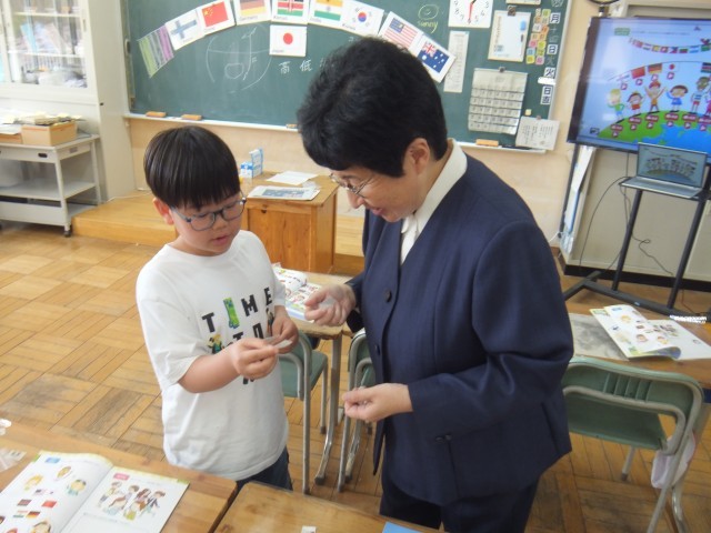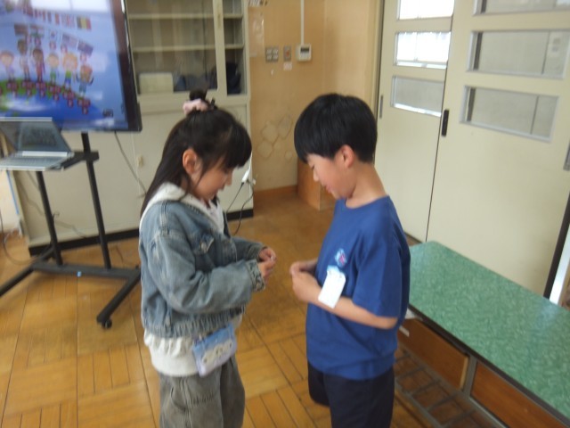 外国語活動では、AETの先生とさまざまな国のあいさつを覚えました。難しいあいさつも真似して、上手に言うことができました。それから、ペアであいさつゲームをして楽しみました。