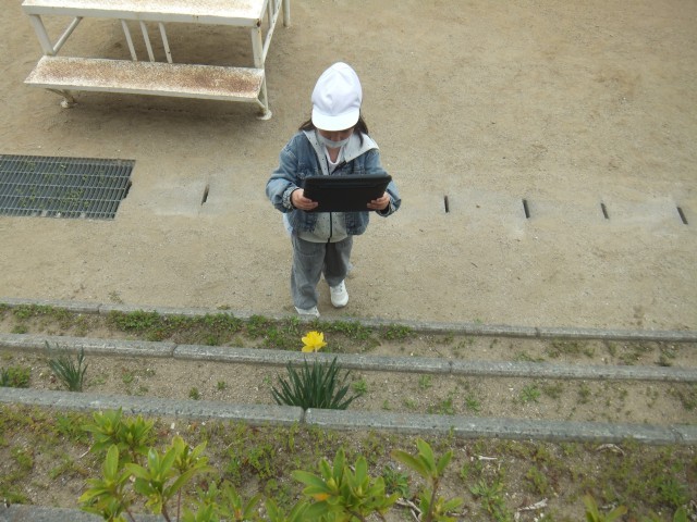 理科の時間、校庭に出て、春の生き物を探しました。サクラやスイセン、なずななどの花やダンゴムシを見つけました。写真に撮る姿も見られました。