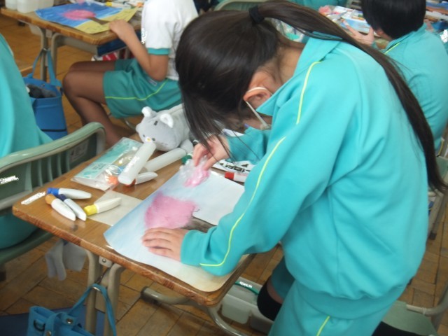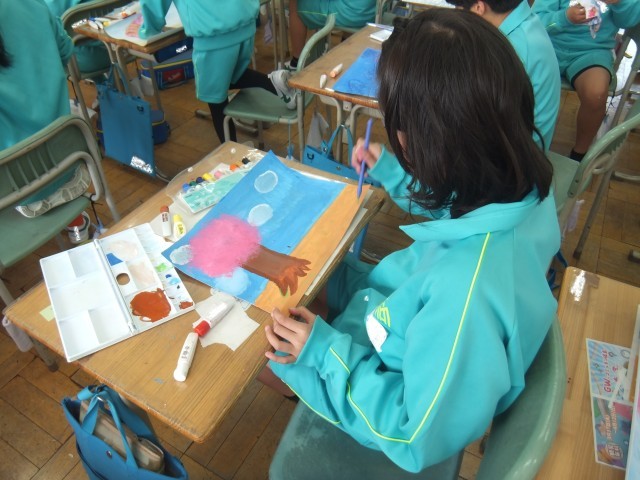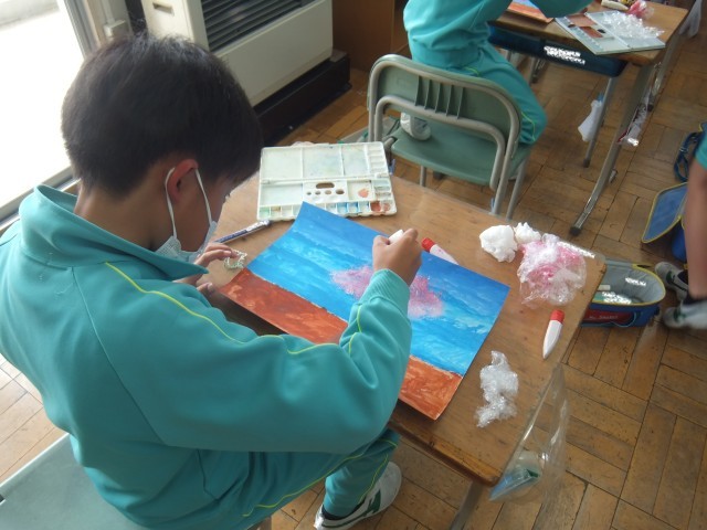 図工の時間、緑ケ丘第一小学校の校庭に咲いているサクラを思いながら、白色と赤色の絵の具の量、水の量を調整しながらサクラの色を作ったり、サクラの花びらをラップを丸めたもので描いたりと工夫して、サクラを表現しました。